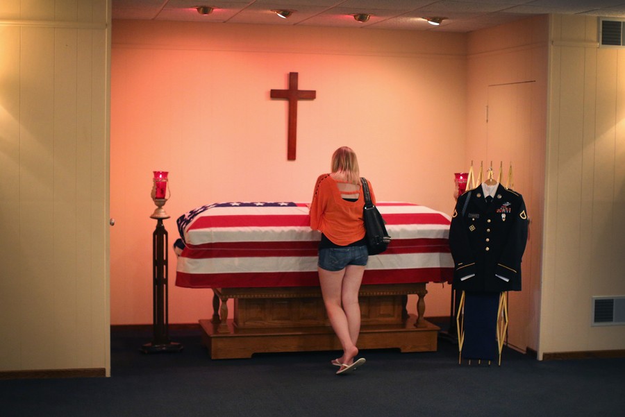 Read moreJackie Rozek spends a quiet moment with the remains of her long-time boyfriend, U.S. Army Pfc. Aaron Toppen in a chapel at Vandenberg Funeral Home on June 22, 2014 in Mokena, Illinois. Toppen, 19, was killed alongside four other American soldiers and an Afghan soldier in a friendly fire airstrike during a firefight earlier this month in Afghanistan. #