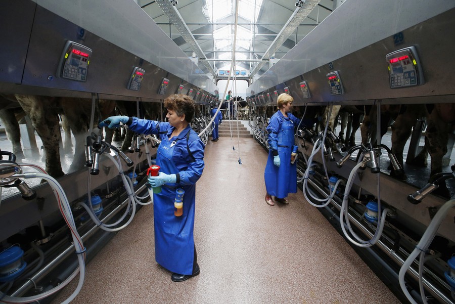 Read moreEmployees prepare cows before milking them at a new dairy farm holding 800 cows on the day of its opening in the village of Petrovskoye in Leningrad region, some 90 km (56 miles) north of St. Petersburg, Russia, on August 8, 2014. #