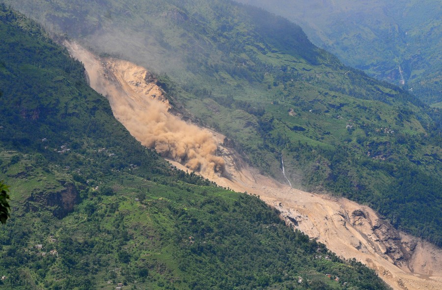 Read moreA cloud of dust rises as loose earth moves down a slope at the site of a landslide in Sindhupalchowk area, east of Katmandu, Nepal, on August 2, 2014. A massive landslide killed at least eight people and blocked a mountain river in northern Nepal, causing the water to form a lake that was threatening to burst and sweep several villages, officials said. #