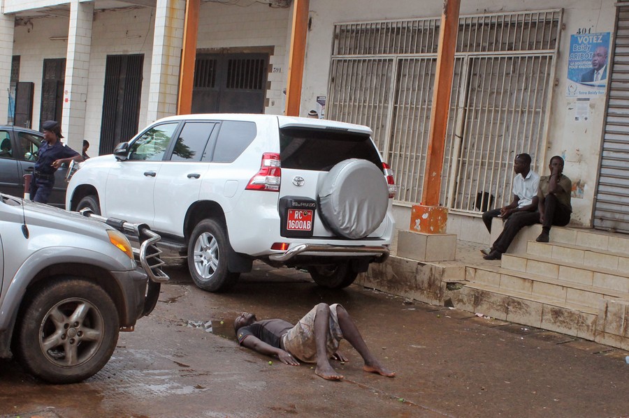 Read moreGuinea Police secure the area around a man who collapsed in a puddle of water on the street in the city of Conakry, Guinea, on August 6, 2014. People would not approach him as they feared he may be suffering from the Ebola virus. The man lay in the street for several hours before being taken to an Ebola control center for assessment. #