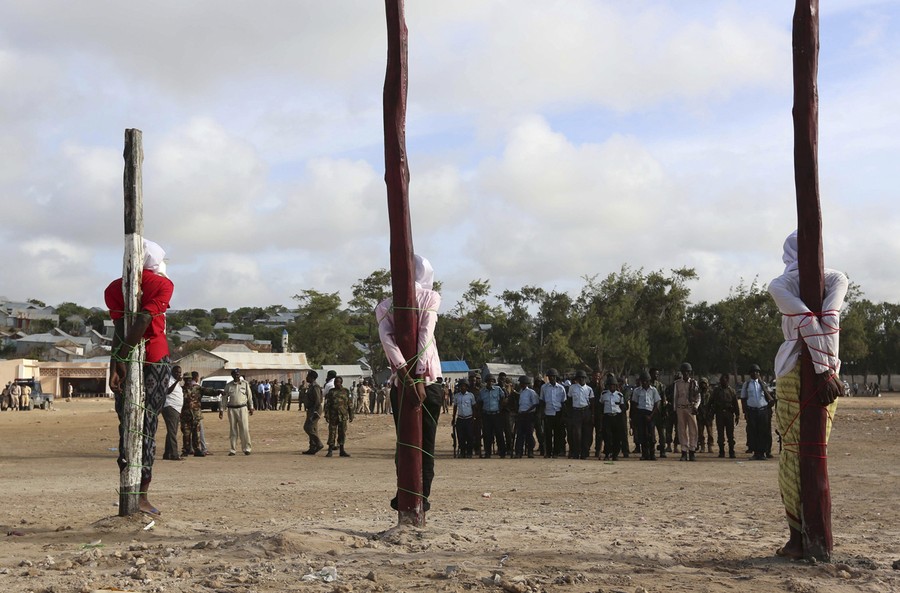 Read moreThree men found guilty by a Somali military court of killing civilians and masterminding a recent attack on the Presidential Palace stand tied to poles shortly before they were executed by a firing squad in capital Mogadishu on August 3, 2014. The three were also members of the militant group Al Shabaab. #