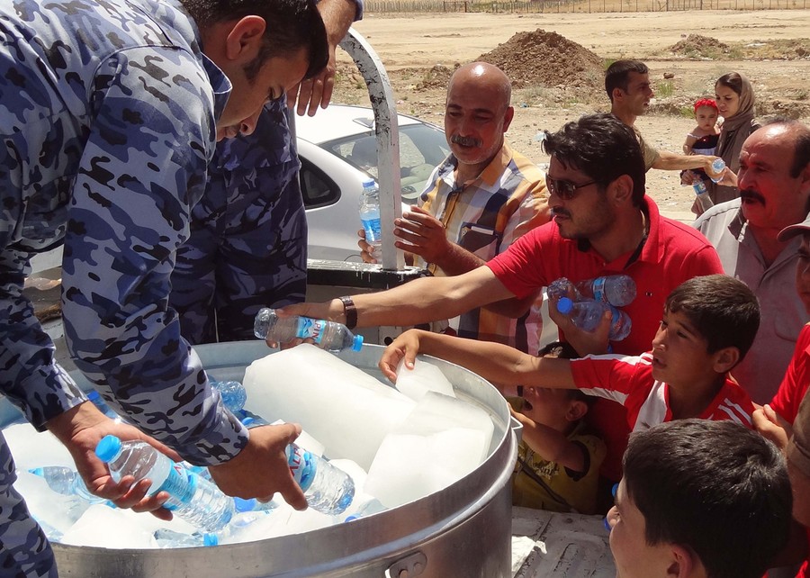 Read moreIraqi military personnel distribute water to Shiite Iraqi Kurds, known as "Shabak", displaced by fierce fighting between Kurdish peshmerga forces and jihadist militants from the Islamic State (IS) after arriving on the road between Kirkuk and Arbil having fled the area of Bartala near the northern Iraqi city of Mosul, on August 8, 2014. Jihadists seized Iraq's largest dam north of their hub of Mosul, giving them control over the supply of water and electricity for a vast area, officials said. #