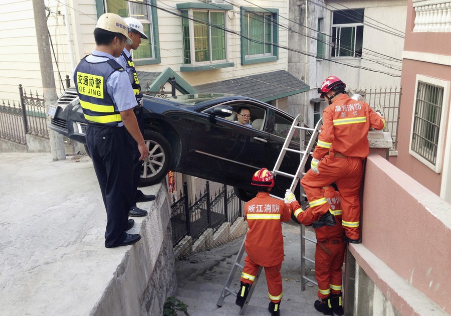 Read moreRescue workers try to help a driver out of his car, after the vehicle was stuck above an alley in Wenzhou, Zhejiang province, China, on August 4, 2014. The car rolled off the edge of a road after the driver was slow to brake. #