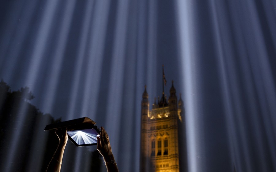 Read moreA woman uses a tablet to photograph shafts of light piercing the night sky at an installation entitled "Spectra" by Japanese artist Ryoji Ikeda located at Victoria Tower Gardens adjacent to the Houses of Parliament in London on August 5, 2014. The work was commissioned to commemorate the centenary of the outbreak of World War I and will be visible from dusk till dawn until the early hours of Monday, August 11. #