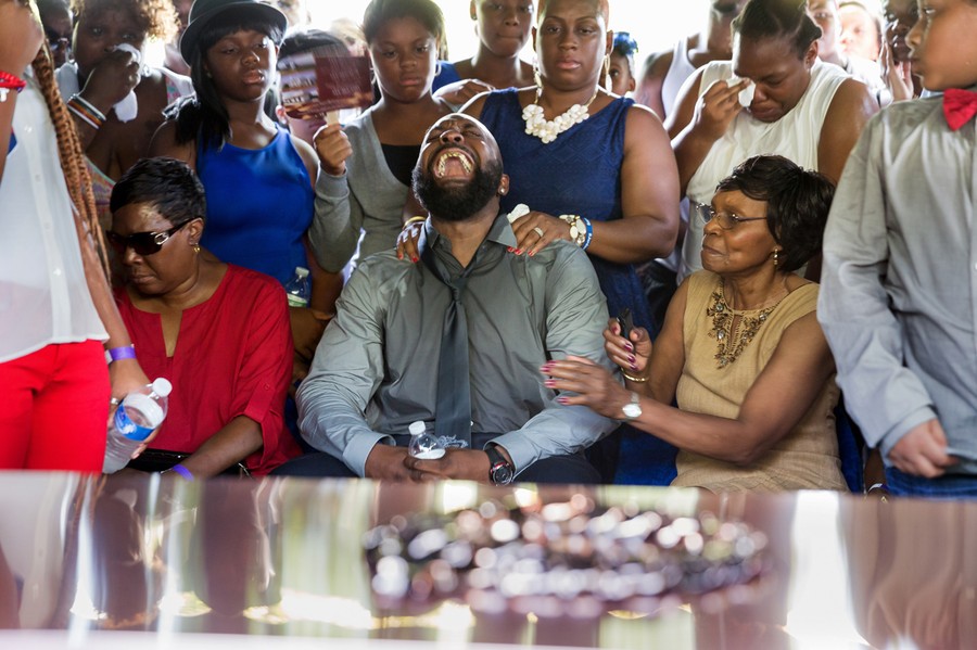 Read moreMichael Brown Sr., yells out as the casket is lowered during the funeral service for his son Michael Brown in Normandy, Missouri, on August 25, 2014. Hundreds of people gathered to say goodbye to Michael Brown, the 18-year-old shot and killed August 9 in a confrontation with a police officer that fueled almost two weeks of street protests. #