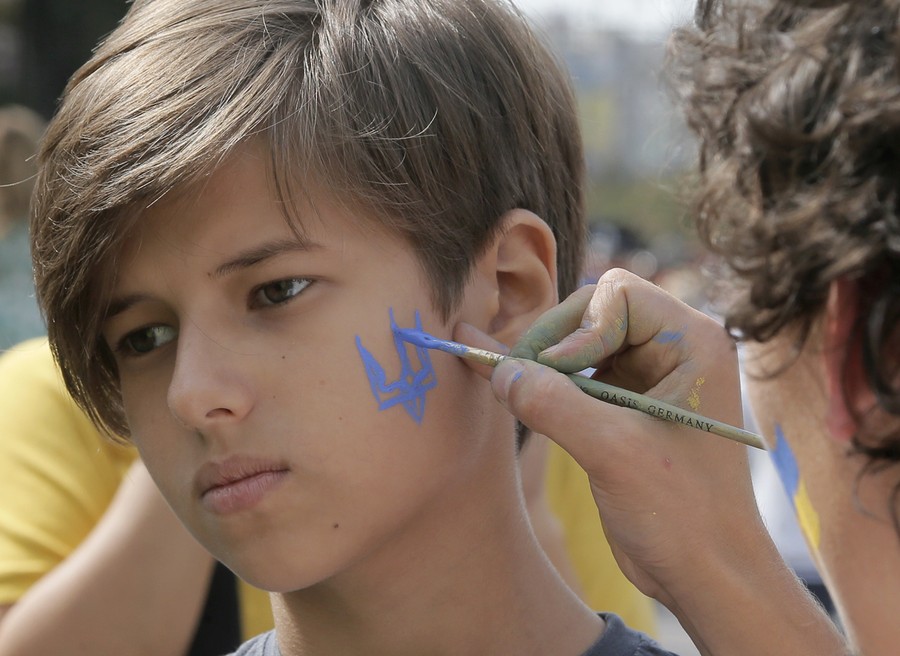 Read moreUkrainians paint each other's faces with national colors and state emblem during celebration of the 23rd anniversary of Ukraine's Independence, in the capital Kiev, on August 24, 2014. #