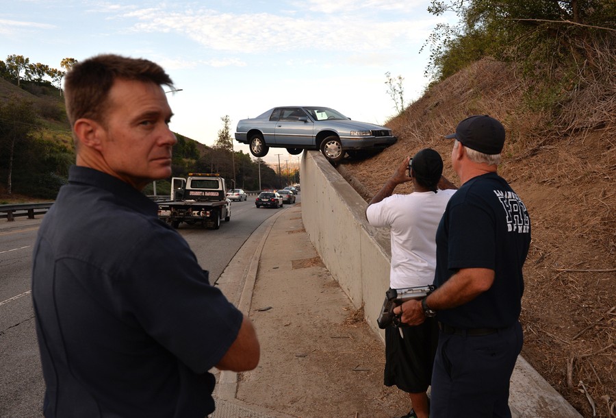 Read moreA car sits atop an embankment after losing control and skidding up the concrete retaining wall on South La Brea Ave in Baldwin Hills, Los Angeles, on August 24, 2014. The driver and his passenger escaped injury. #
