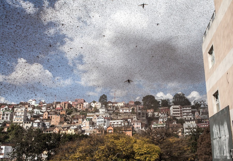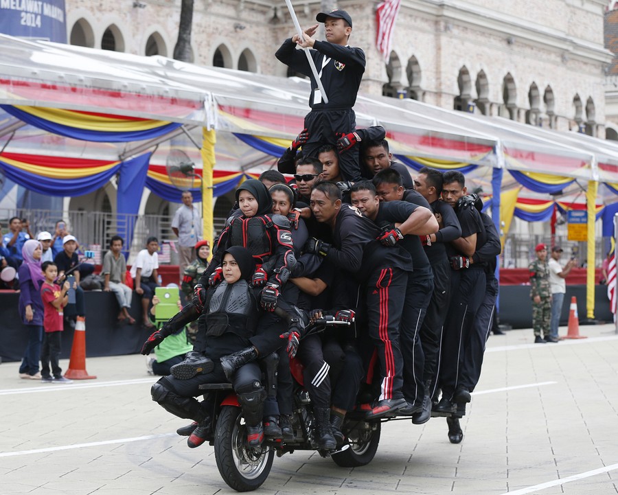 This week we have a look at swarms of locusts in Madagascar, 31 riders on a single motorcycle, magma from Iceland's Bardarbunga volcano, Japan's tidy superhero Mangetsu-man, huge waves in California, and a gigantic French mechanical horse-dragon.