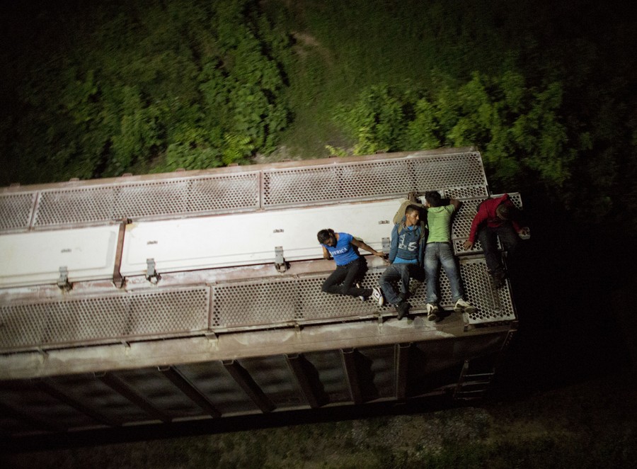 Read moreCentral American migrants rest atop the last boxcar of a moving freight train as it heads north from Arriaga toward Chahuites, Mexico, on August 26, 2014. A Mexican crackdown seems to be keeping women and children off the deadly train, known as "The Beast," that has traditionally helped thousands of migrants head north. The once-open route to the United States has become so difficult that trains now carry a small fraction of the migrants they used to, and almost exclusively adult men. #