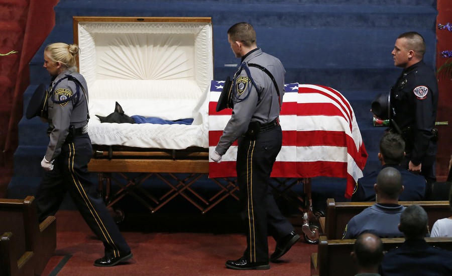 Read morePolice officers file past the casket of Oklahoma City police canine officer K-9 Kye during funeral services in Oklahoma City on August 28, 2014. K-9 Kye died on August 25 after being stabbed by a burglary suspect on August 24. #
