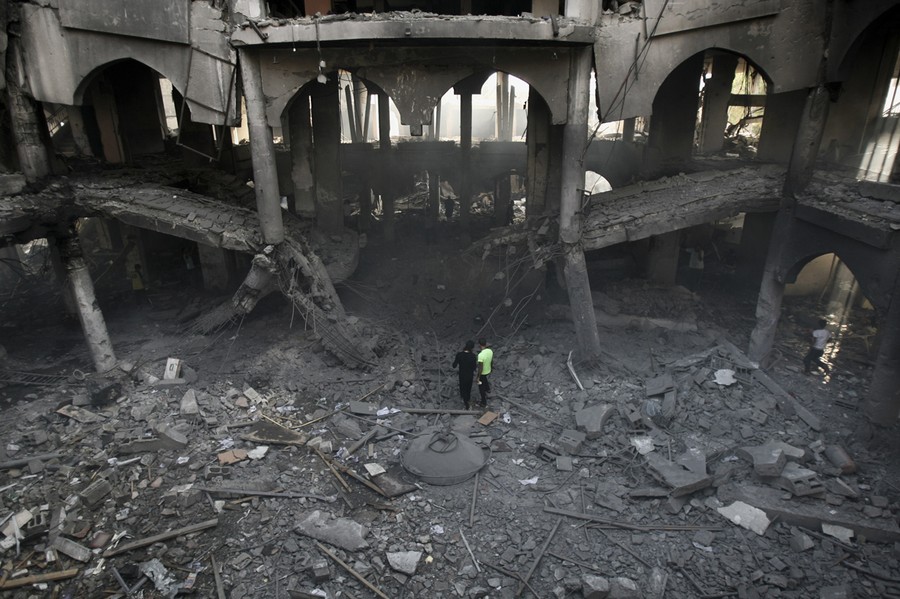 Read morePalestinians inspect the damage of a Rafah commercial center after an Israeli strike in Rafah, in the southern Gaza Strip, on August 24, 2014. The Gaza police operation room reported three airstrikes on a Rafah commercial center, which consists of two floors and includes 100 shops. The building almost collapsed and a huge fire erupted in the shops. #