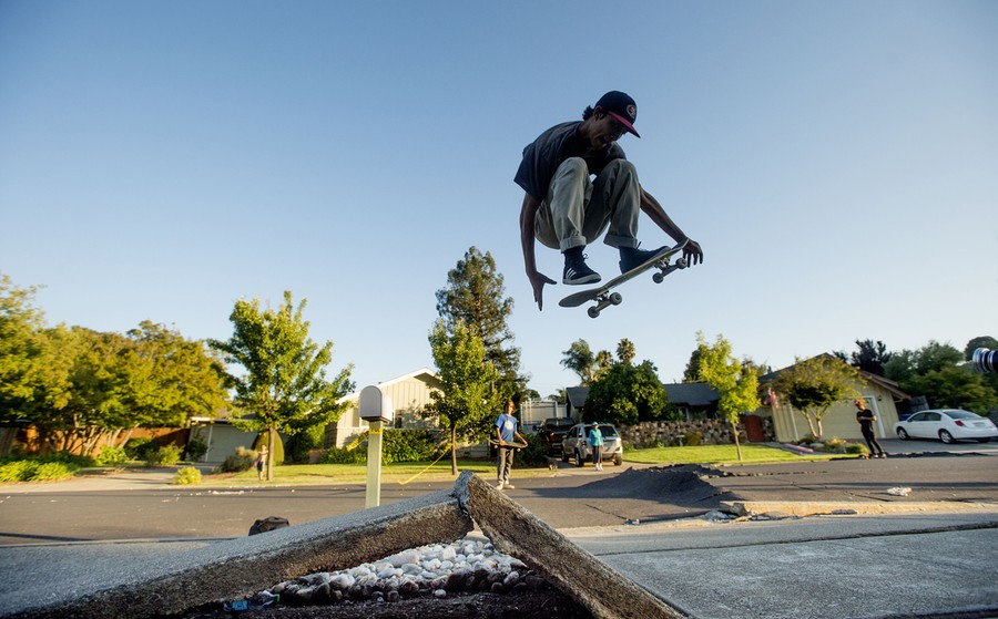 Read moreSkateboarder Chris Young, 22, launches himself off a buckled sidewalk in Napa, California, following an earthquake on August 24, 2014. Officials in the city of Napa say 15 to 16 buildings are no longer inhabitable after Sunday's magnitude-6.0 earthquake, and there is only limited access to numerous other structures. #