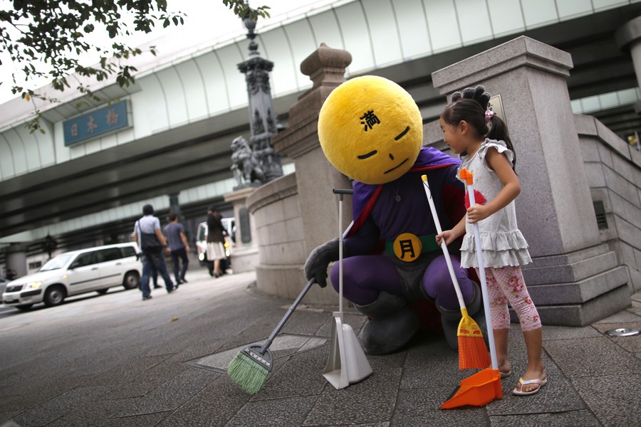Read moreAn unidentified man, who calls himself Mangetsu-man (Mr. Full Moon), pauses as he cleans Nihonbashi bridge using a broom with a volunteer, while clad in a costume featuring a full moon for a head, in Tokyo, on August 25, 2014. While most superheroes fight crime, for Mangetsu-man the enemy is garbage and his "super" weapons are a broom, a dustpan and an army of volunteers who have joined his mission. He first appeared on the streets of Tokyo last year without any publicity or fanfare and mainly cleans around the city's Nihonbashi bridge. #