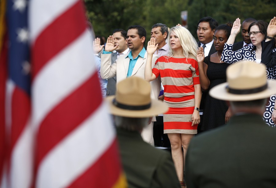 Read moreMembers of the National Park Service watch as new U.S. citizens raise their hands for their oath of allegiance during a special naturalization ceremony held at the Martin Luther King Jr. Memorial in Washington, District of Columbia, on August 28, 2014. #