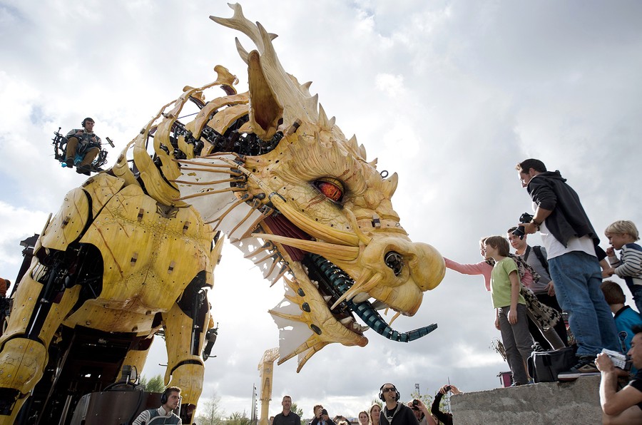 Read moreA mechanical horse-dragon made of wood and steel is presented to the public in Nantes, western France, on August 26, 2014. This horse-dragon, created by the French artist Francois Delaroziere of "Les machines de l'ile" (The Machines of the Isle), is the hero of the show "Long Ma" which will be presented in Beijing on October 17, 2014 as part of the fiftieth anniversary of the relationship between France and China. #