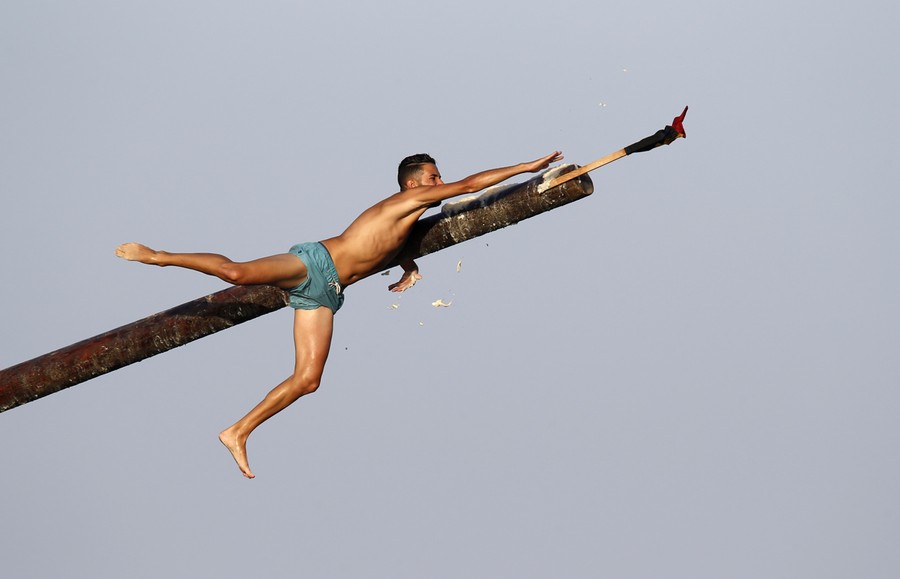 Read moreA man tries to grab a flag as he slips off the "gostra", a pole covered in grease, during the week-long celebrations for the religious feast of St Julian, patron of the town of St Julian's, outside Valletta, on August 24, 2014. In the traditional game stretching back to the Middle Ages, young men, women and children have to make their way to the top of a pole and try to uproot one of the flags to win prizes. #