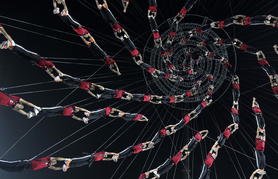 Read moreStudents of Shaolin Tagou Martial Arts School are suspended in mid-air as they practice in a dress rehearsal for a stunt performance which is part of the opening ceremony of the 2014 Nanjing Youth Olympic Games, at a stadium in Nanjing, Jiangsu province, China, on August 14, 2014. A total of 520 students took part in the performance named "Building the dream", which will be performed during the opening ceremony of the Youth Olympic Games on August 16. #
