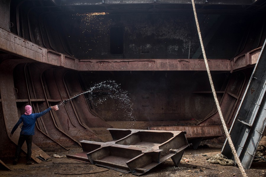 Read moreA worker throws water on a fire that started in the ships hull while it was being broken down for scrap in the township renamed by residents as "Yolanda Village" on August 15, 2014 in Tacloban, Leyte, Philippines. Residents of Tacloban city and the surrounding areas continue to focus on rebuilding their lives nine months after Typhoon Haiyan struck the coast on November 8, 2013, leaving more than 6,000 dead and many more homeless. #