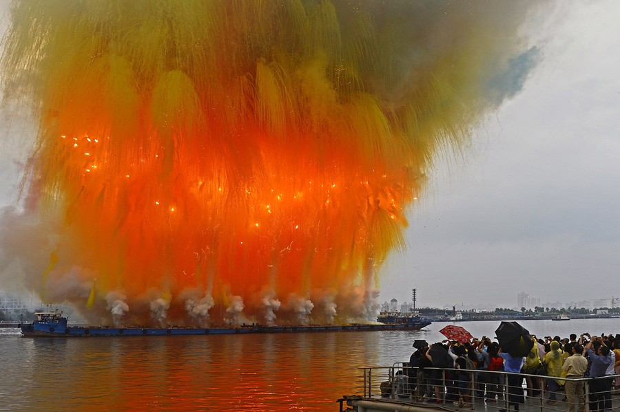Read morePeople watch a daytime color-smoke explosive show over the Huangpu River at the Bund, in Shanghai, on August 8, 2014. The firework show is designed by Cai Guoqiang, to mark the opening of his exhibition "The Ninth Wave". #