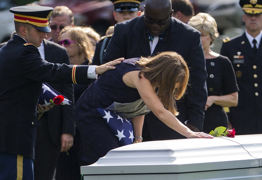 Read moreArmy 1st Lt. Matthew Greene, left, reaches out for his mother, retired Col. Susan Myers, as she places a rose on the casket of her husband, Army Maj. Gen. Harold Greene during a burial service at Arlington National Cemetery in Arlington, Virginia, on August 14, 2014. Greene was killed when a gunman dressed as an Afghan soldier turned on ISAF troops, wounding about 15 including a German general and two Afghan generals. He is the highest-ranking U.S. military officer to be killed in America's post-9/11 wars. #