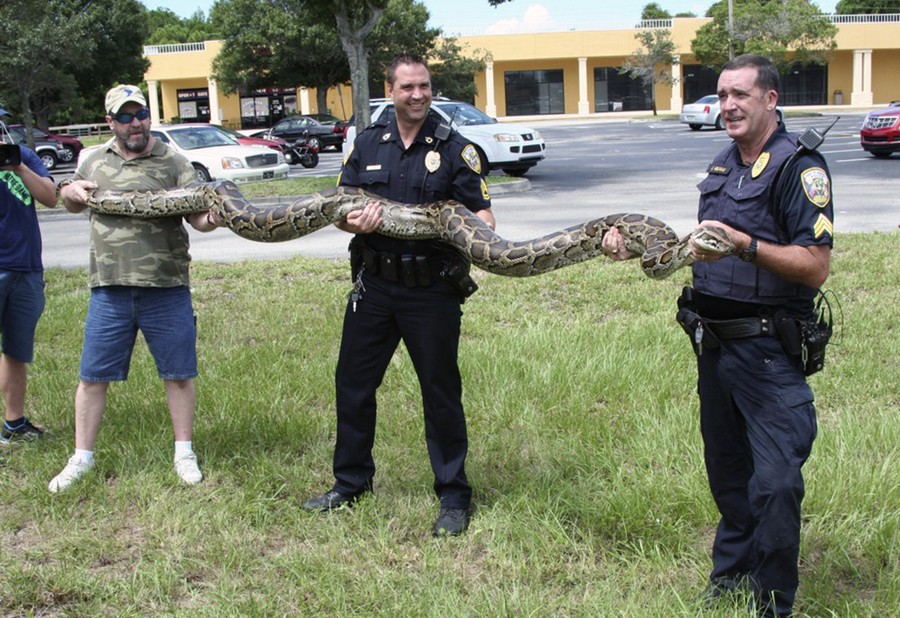 Read morePort St. Lucie police officers display a captured 12-foot Burmese Python in this handout photo provided on August 11, 2014. Wildlife investigators may have solved a classic Florida whodunit with the capture of the snake in a neighborhood where cats have been disappearing. #
