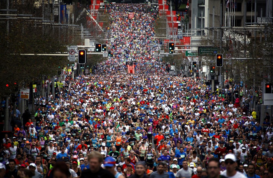 Read moreRunners start the 44th annual City2Surf fun run down Sydney's William Street on August 10, 2014. Around 80,000 people participated in the run, which covers a distance of 14km (8.7 miles) from the city to Bondi Beach. #