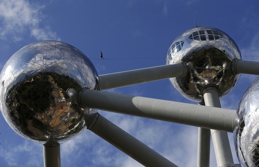 Read moreA tightrope walker performs between two spheres of the Atomium monument in Brussels on August 11, 2014. The 102-meter-tall (335-feet-tall) structure and its nine spheres, which was designed for Expo 58, is in the shape of a unit cell of an iron crystal, magnified about 165 billion times. #