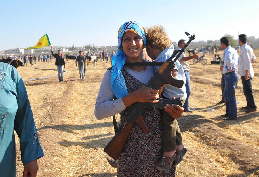 Read moreA Syrian Kurdish woman holds an AK-47 and a child on the Turkish side of the Syrian border after refugees and Turkish protestors pulled down a part of the Turkish-Syrian border fence, near the southeastern town of Suruc in Sanliurfa province, on September 26, 2014. Nearly 140,000 Syrian Kurds have fled into Turkey since last week, the fastest exodus of the entire three-year civil war. The United Nations refugee agency said on Tuesday it was making contingency plans in case all 400,000 inhabitants of the Syrian Kurdish town of Kobani fled into Turkey to escape advancing Islamic State militants. #