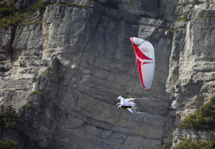 Read moreA paraglider performs a demonstration flight during the masquerade contest of the 41st Icare Cup paragliding festival in Saint Hilaire du Touvet, French Alps, on September 20, 2014. #