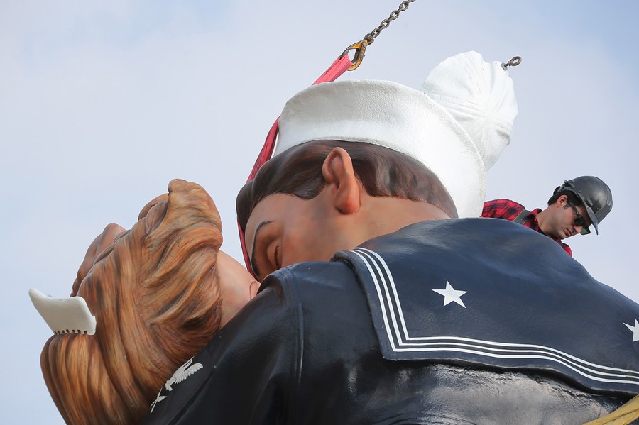 Read moreA worker prepares to place "Unconditional Surrender," an 8-meter (25-foot) cast-bronze sculpture in color of a sailor and a nurse in lip-locked embrace, outside the Caen Memorial in Normandy, France, on September 23, 2014. #