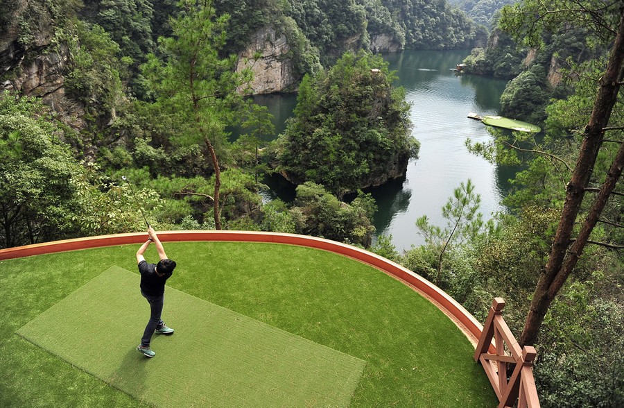 Read moreA staff member plays a shot towards a putting green on a lake from a tee on top of a hill, at Zhangjiajie, Hunan province, China, on September 23, 2014. An invitational competition for Chinese and Korean celebrities will be held this month in Zhangjiajie, and any player who can make a hole in one will be awarded $1,000,000, local media reported. #