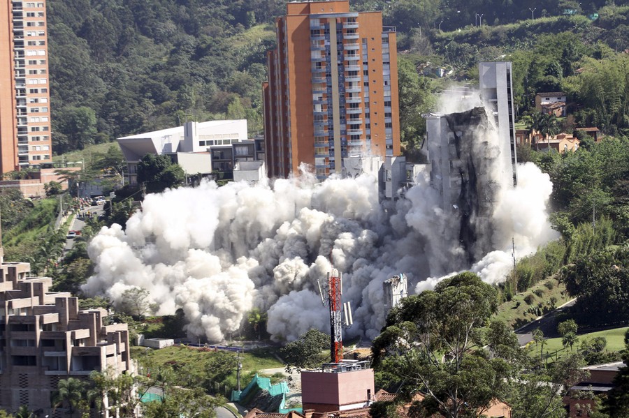 Read moreThe CuatroTorres residential building complex is demolished during a controlled implosion, in the city of Medellin on September 23, 2014. Colombian authorities imploded the Medellin apartment building that partially collapsed almost a year ago, killing 11 people. #