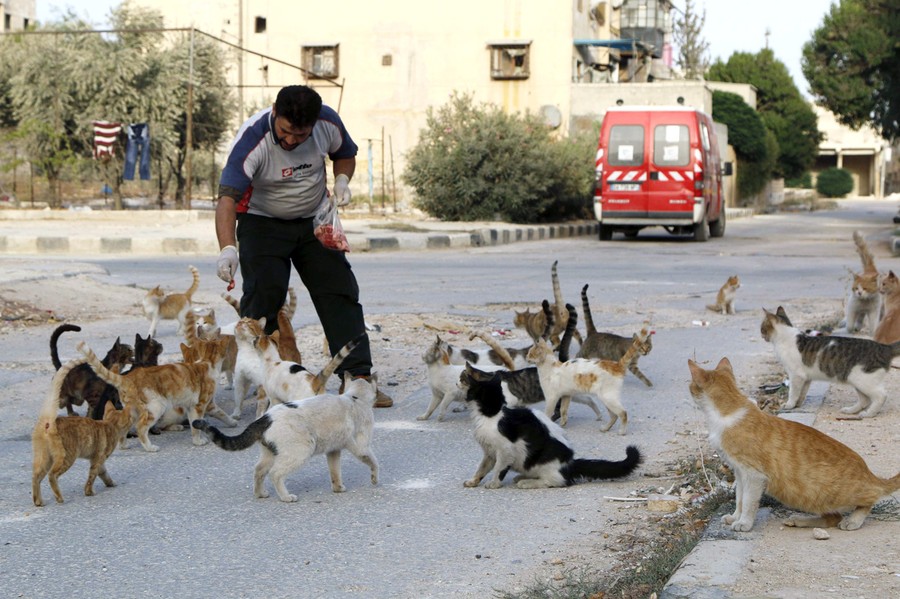 Read moreAlaa, an ambulance driver, feeds cats in Masaken Hanano in Aleppo, Syria, on September 24, 2014. Alaa buys about $4 of meat everyday to feed about 150 abandoned cats in Masaken Hanano, a neighborhood in Aleppo that has been abandoned because of shelling from forces loyal to Syria's president Bashar Al-Assad. Alaa said that he has been feeding and taking care of the cats for over 2 months. #