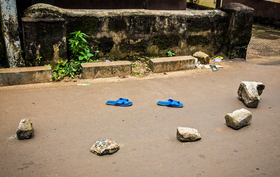 Read moreThe shoes of a suspected Ebola patient, cordoned off with stones by local residents in Freetown, Sierra Leone, on September 24, 2014. U.S. health officials Tuesday laid out worst-case and best-case scenarios for the Ebola epidemic in West Africa, warning that the number of infected people could explode to at least 1.4 million by mid-January -- or peak well below that, if efforts to control the outbreak are ramped up. #