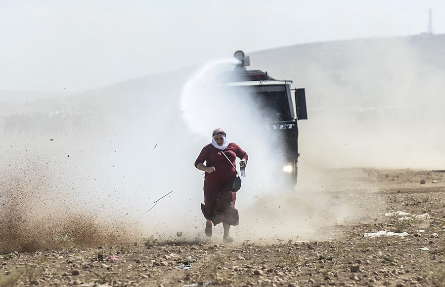 Read moreA Kurdish woman runs away from a water cannon during clashes with Turkish soldiers near the Syrian border, after Turkish authorities temporarily closed the border, blocking young Syrian Kurds who had accompanied their families into Turkey from returning to the battlefront, on September 22, 2014. #