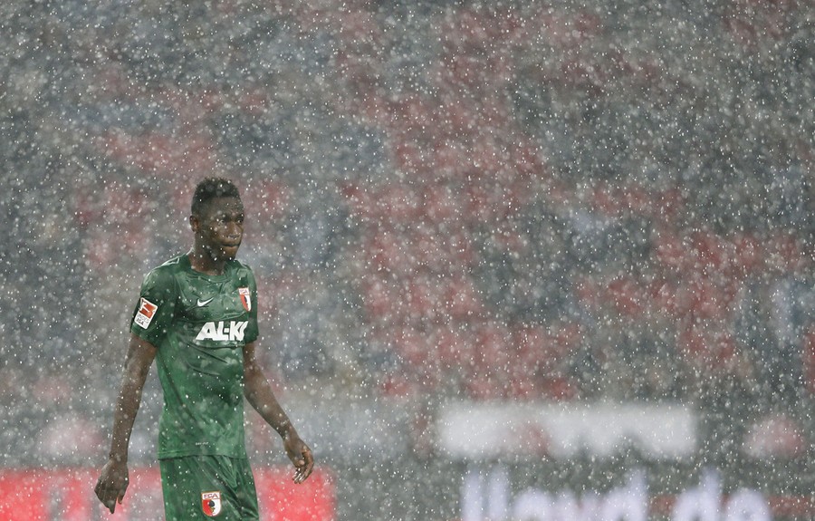 Read moreAugsburg's Abdul Rahman Baba leaves the pitch due to heavy rain during his team's Bundesliga German first league soccer match against Bayer Leverkusen in Leverkusen on September 24, 2014. The match was interrupted for several minutes due to lightning and heavy rainfall. #