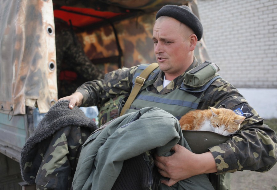 Read moreA Ukrainian soldier holds a cat as he receives warm clothes close to Luhansk in eastern Ukraine on September 23, 2014. Despite a declared cease-fire between the separatists and the Ukrainian military in eastern Ukraine, occasional shooting has been reported. #