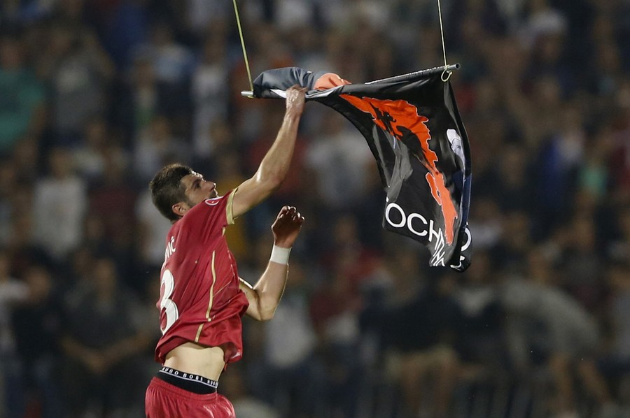 Read moreStefan Mitrovic of Serbia grabs a flag depicting so-called Greater Albania, an area covering all parts of the Balkans where ethnic Albanians live, that was flown over the pitch during the Euro 2016 Group I qualifying soccer match between Serbia and Albania at the FK Partizan stadium in Belgrade October 14, 2014. The politically-sensitive Euro 2016 qualifier between Serbia and Albania was then abandoned following a brawl between players from both sides after the flag stunt. #