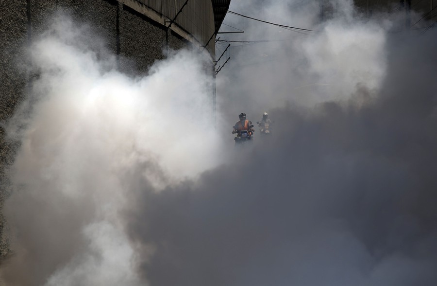 Read morePeople on a motorcycle ride through a thick cloud as a fumigation truck from the Sucre municipality works to control the spread of Chikungunya and dengue fever, spread by mosquitoes, in the Petare slum district of Caracas. Medical shortages have complicated Venezuela's efforts to treat outbreaks of mosquito-borne fevers, creating long lines at pharmacies to buy analgesics and leaving the ill without ways to control the swelling joints and aching bones that the diseases cause. #