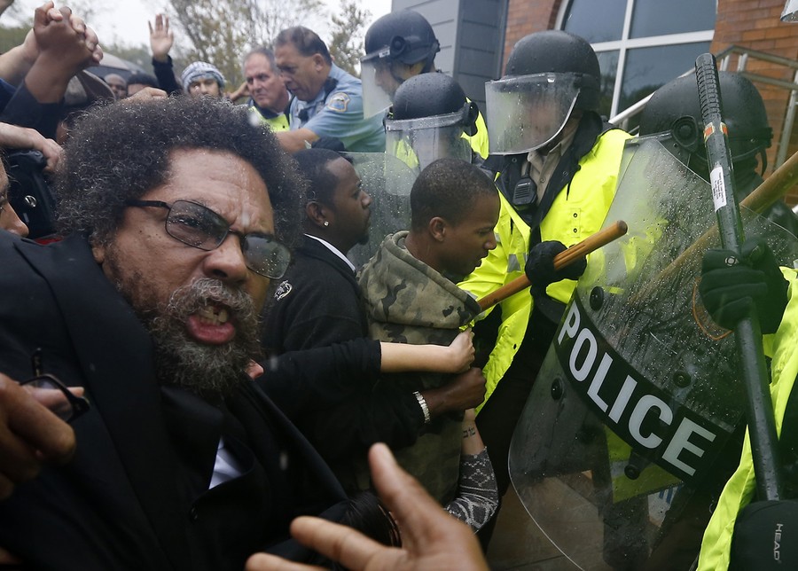 Read moreActivist Cornel West is knocked over in a scuffle with police during a protest at the Ferguson Police Department in Ferguson, Missouri, on October 13, 2014. Hundreds of protesters converged in the pouring rain on the Ferguson, Missouri, police department on Monday as they launched another day of demonstrations over the August killing by police of an unarmed black teenager. #