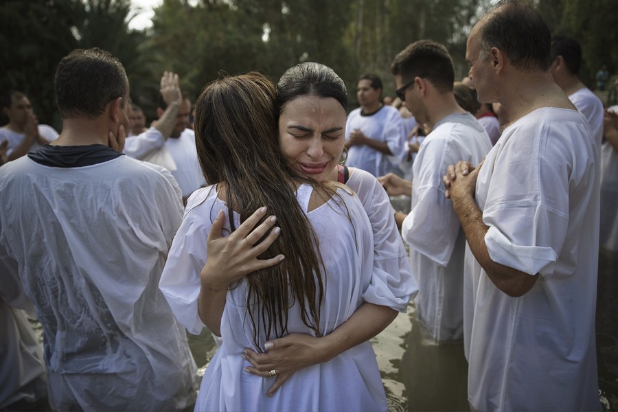 Read moreChristian pilgrims from Brazil embrace after they are baptized in the water of the Jordan River during a ceremony at the Yardenit baptismal site near the northern Israeli city of Tiberias on October 15, 2014. Yardenit is one of the sites along the Jordan River where it is believed Jesus was baptized. #