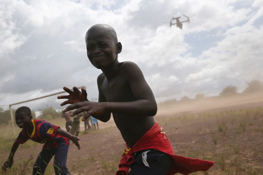 Read moreBoys run from the blowing dust as a U.S. Marine MV-22 Osprey tiltrotor departs the site of an Ebola treatment center under construction on October 15, 2014 in Tubmanburg, Liberia. The center is the first of 17 Ebola treatment centers being built by Liberian forces under American supervision as part of Operation United Assistance to combat the Ebola epidemic. #