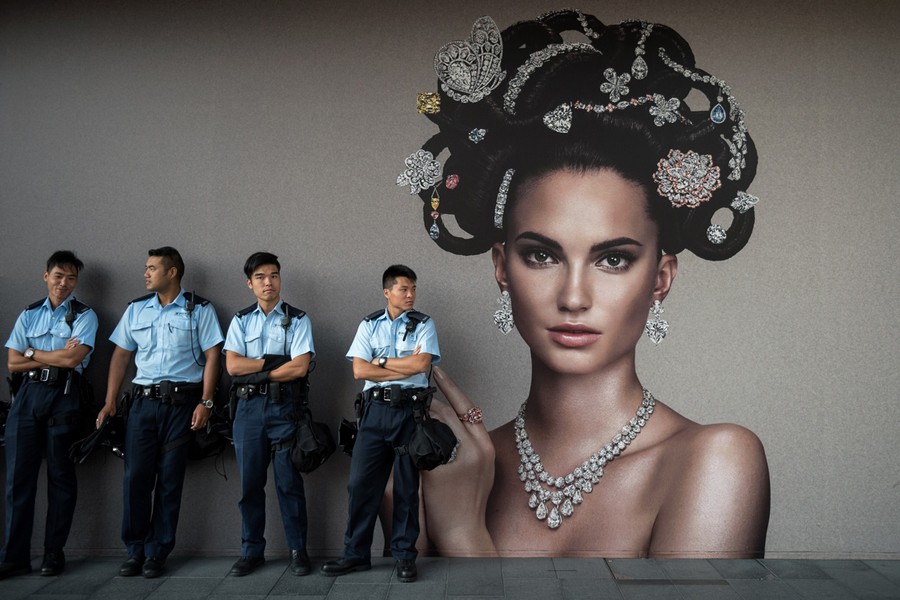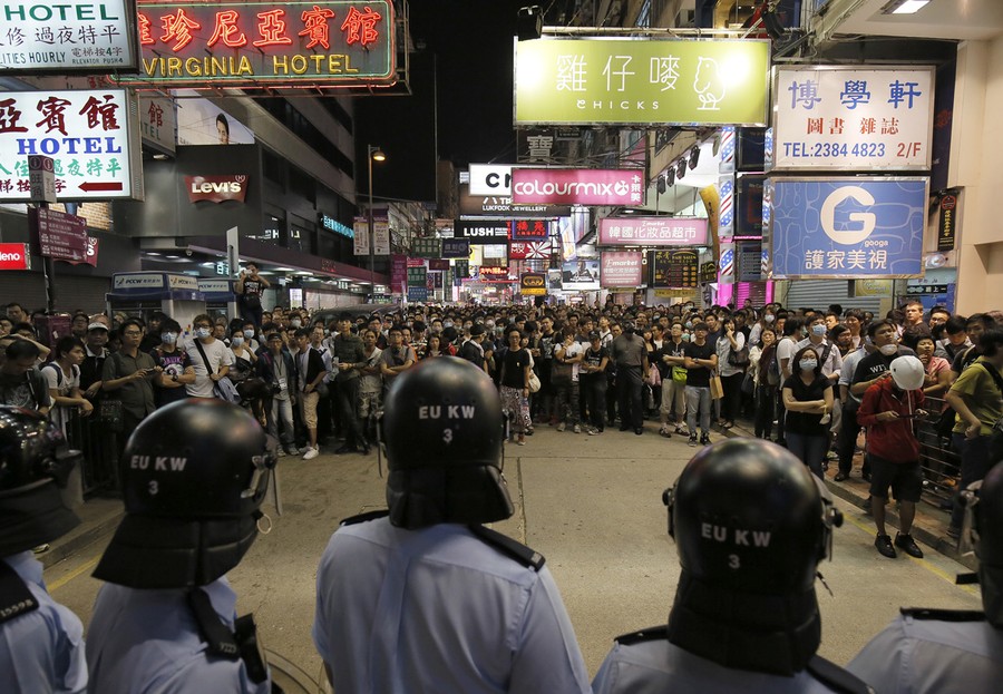 Read moreRiot police officers stand guard at a main road in the Mong Kok district of Hong Kong on October 17, 2014. New scuffles broke out Friday night between Hong Kong riot police and pro-democracy activists in a district where police cleared protesters earlier in the day. The chaotic scenes unfolded hours after police moved in to clear tents, canopies and barricades at Mong Kok, a smaller protest zone across Victoria Harbor from the main occupied area in the heart of the financial district. #
