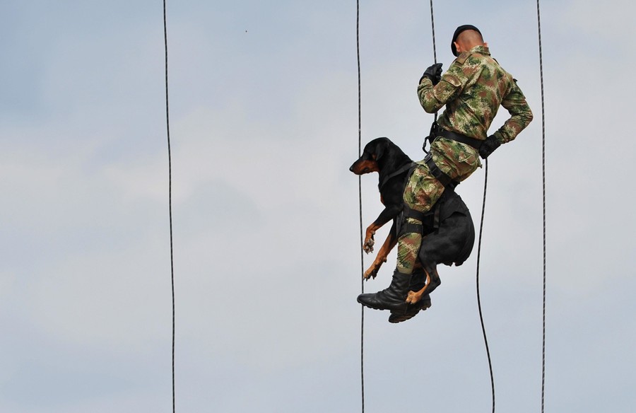Read moreA Colombian Army Special Forces soldier rappels with a dog in a military exercise during the visit of US Secretary of Defense Chuck Hagel and Colombian Defense Minister Juan Carlos Pinzon at a military base in Tolemaida, Colombia, on October 10, 2014. #