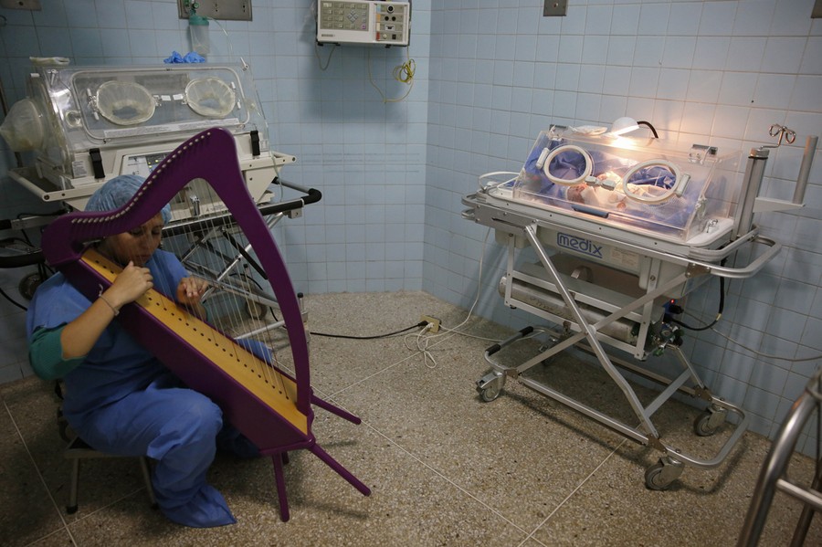 Read moreA member of "El Sistema" plays on a harp, as part of the "New Members" program, next to a newborn baby at a public maternity hospital in Caracas, Venezuela, on October 1, 2014. In a nation awash with guns and with one of the world's highest murder rates, Venezuela's hugely successful classical music program, called "El Sistema", has for decades sought to counteract poor children's exposure to violence with the gentle and inspiring influence of classical music. It used to only admit children aged at least 5. But under its latest "New Members" projects, hundreds of smaller infants can receive voice lessons, musical initiation with paper-made instruments, and free concerts, at its base in Caracas. #