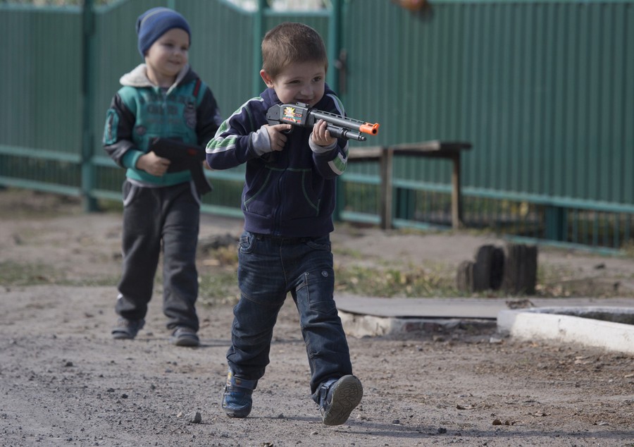Read moreBoys play with toy guns near an area where shelling killed several people in Sartana village, on the outskirts of the town of Mariupol, eastern Ukraine, on October 15, 2014. #