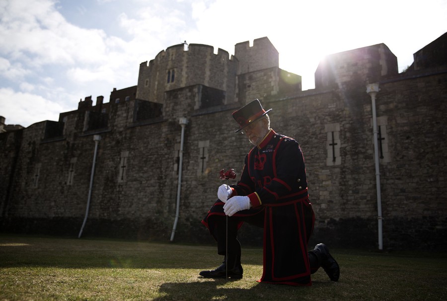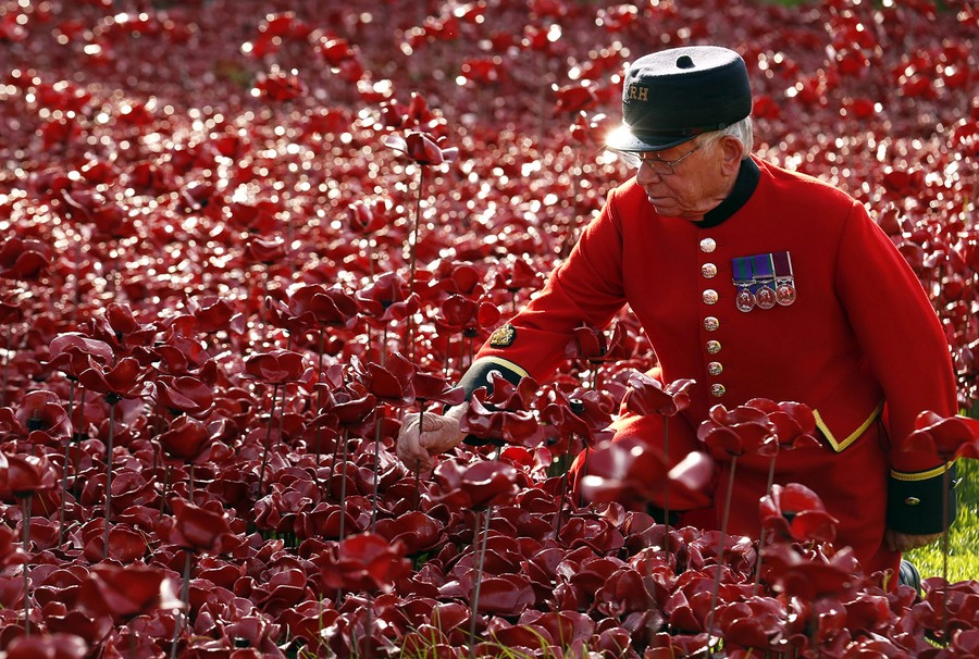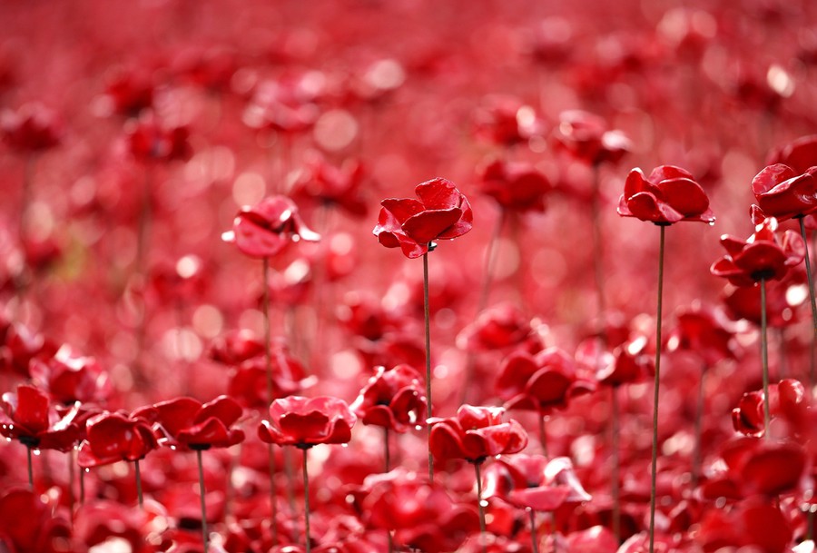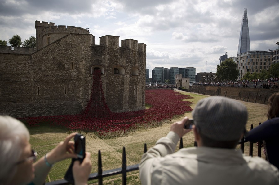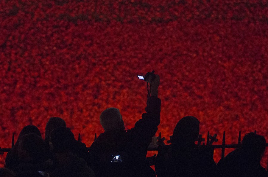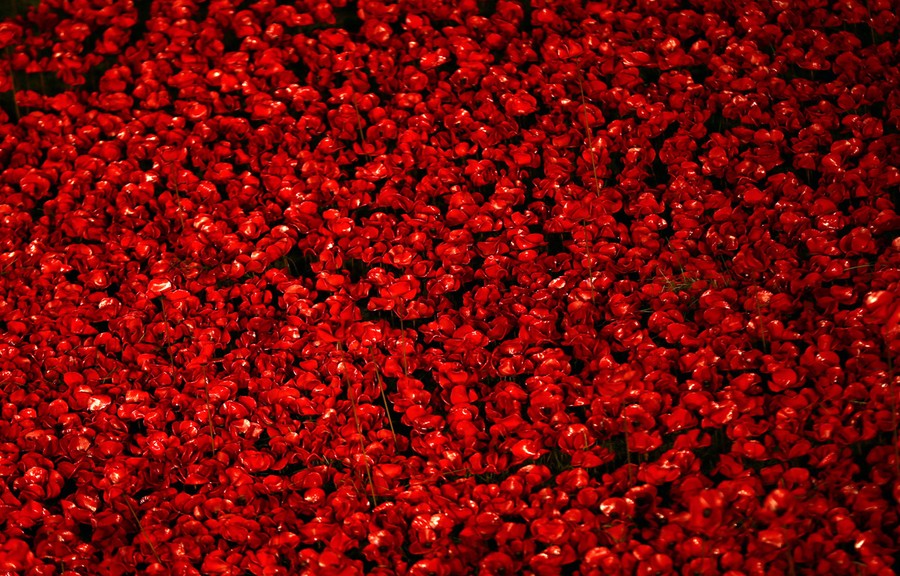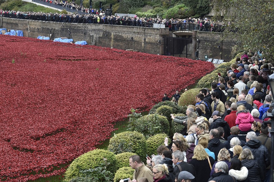 This year marks the 100th anniversary of the start of World War I in 1914. On this year's Armistice Day in London, a massive work of art dedicated to commonwealth servicemen and women lost a century ago reached its conclusion. The evolving installation, titled "Blood Swept Lands and Seas of Red", began back on July 17, with the placing of a single ceramic poppy in the moat of the Tower of London. In the months since, another 888,245 poppies were added, each representing a military fatality from World War I. The poppies were arranged to appear as a flowing sea of blood pouring from the Tower's "Weeping Window". More than four million visitors have already viewed the installation, which will start to come down soon.