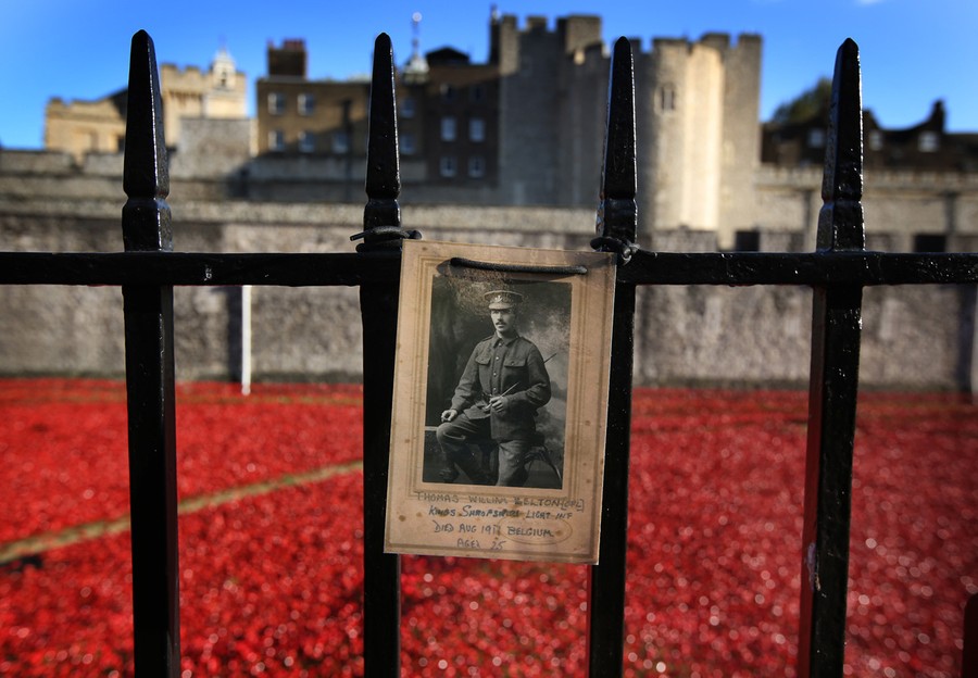 Read moreA photograph of Corporal Thomas William Belton of the Kings Shropshire Light Infantry, who died in Belgium in World War One at the age of 25, is placed on railings surrounding the "Blood Swept Lands and Seas of Red" installation on November 9, 2014. #