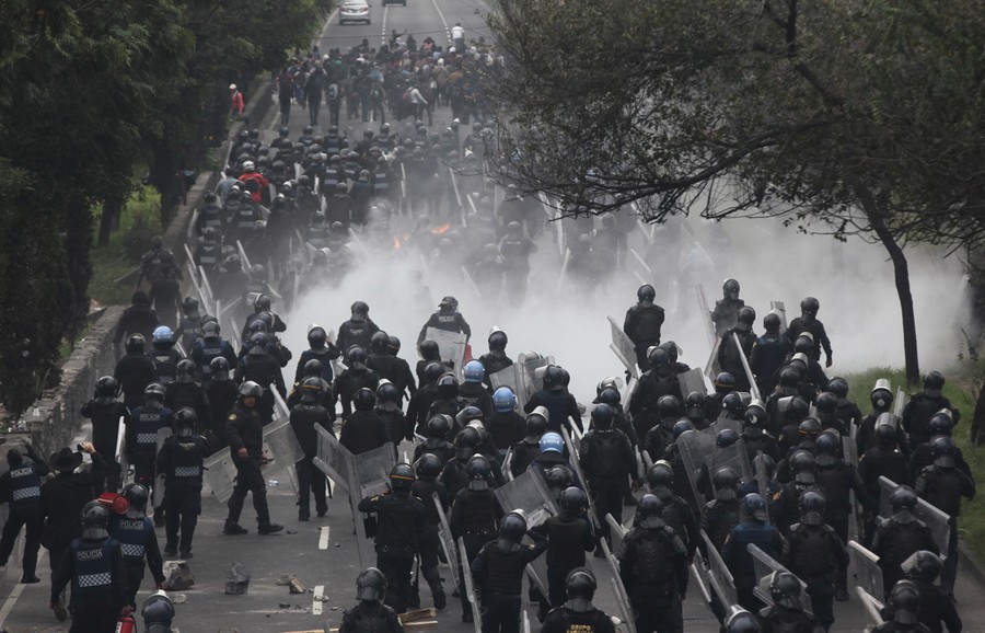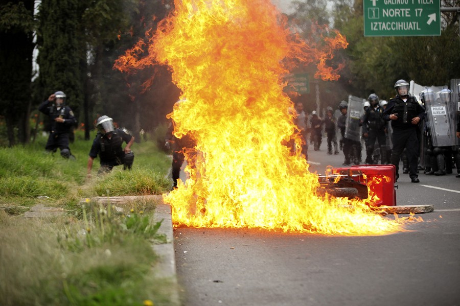 Read moreScores of riot police march to confront protesters near the airport in Mexico City on November 20, 2014. Protesters, some with their faces covered in masks or bandannas, scuffled with police as they tried to block a main expressway to the Mexico City international airport. Protesters hurled rocks and fireworks at the police, at least one of whom was hit by the projectiles. Protesters marched in Mexico City to demand authorities find 43 missing students on Thursday, a day traditionally reserved for the celebration of the country's 1910-1917 Revolution. #