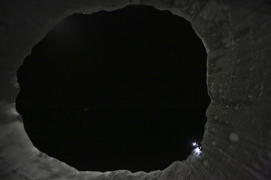Read moreA member of an expedition group on the edge of a newly formed crater on the Yamal Peninsula, northern Siberia, on November 8, 2014. A group of scientists and discoverers managed to descend down to about 16 meters (52.4 feet) and reached the frozen surface of the base of the crater with a lake at least 10 meters (32.8 feet) deep below, according to Vladimir Pushkarev, head of the Russian Center of Arctic Exploration. Experts, including geologists and historians, have not come to a consensus about the origin of the funnel yet, Russian media report. #
